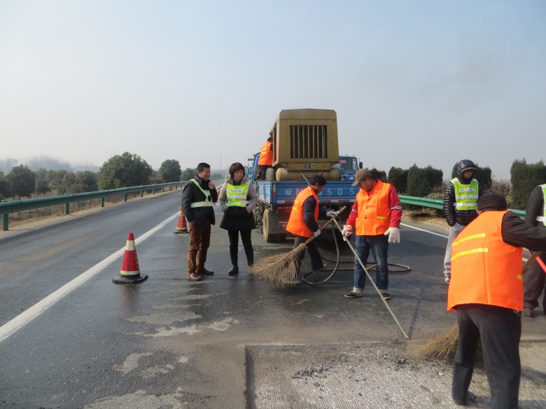 為確保春運(yùn)暢通,應(yīng)安徽省交通投資集團(tuán)道路養(yǎng)護(hù)管理有限公司、高速公路六安管理公司的要求,在合六葉高速公路七大隊(duì)和路政大隊(duì)的協(xié)助下,我單位于2014年1月15日對合六葉高速公路下行線11月22日交通事故損毀路段(K668+000m-K667+930m)進(jìn)行搶修養(yǎng)護(hù),于16日下午15:00圓滿竣工。